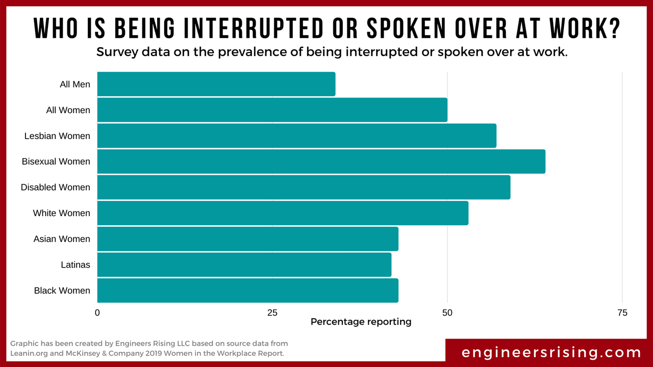 In fact, men are almost three times more likely to interrupt women than other men in meetings! Check out this data from Leanin.org and McKinsey & Company about who is interrupted during meetings: